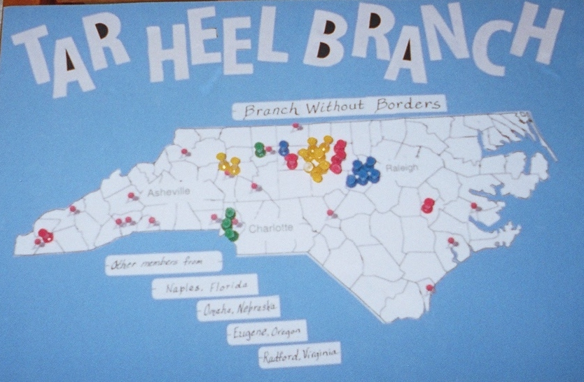 Each branch was asked to bring a display representing their branch. This shows where all the Tar Heel Branch members live — from Murphy to Kinston, after only nine months we are serving much of the state. [Here is another version of the map that shows the distribution of primary and dual members.]