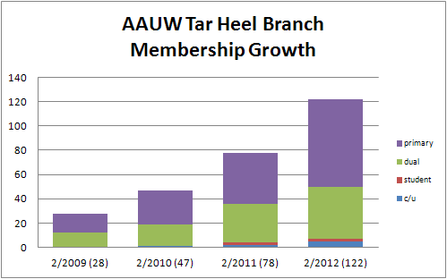 Our percentage of dual members (those who pay AAUW dues through another branch) is much higher than for most branches, so it may be more useful to look at the growth in the member of primary members. We had 42 primary members as of 2/1/2011 and 72 as of today — a growth rate of more than 70%.